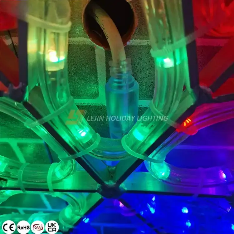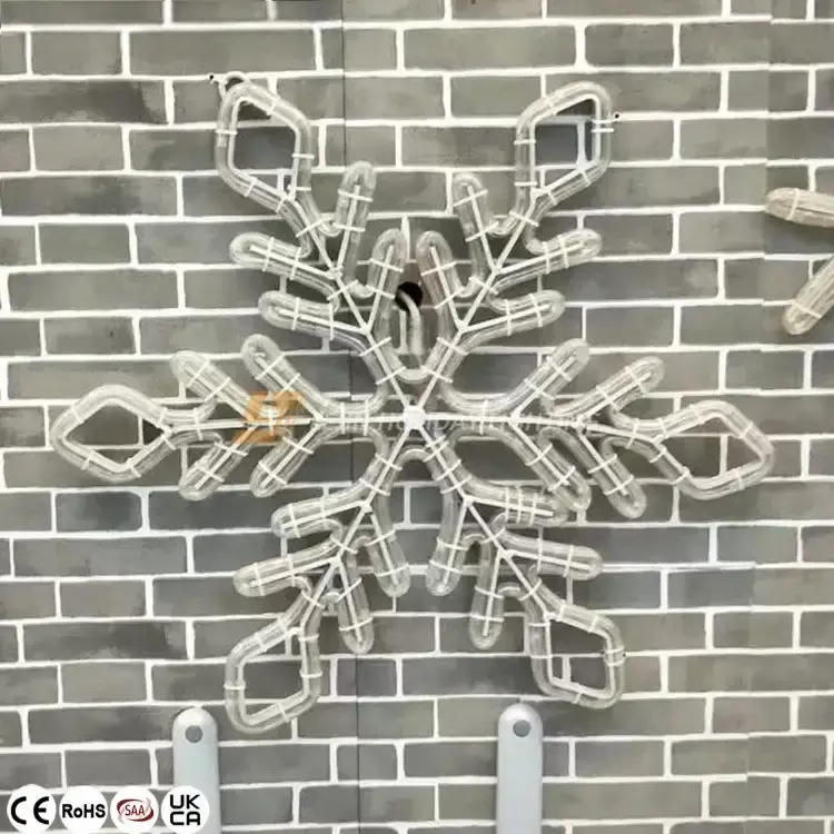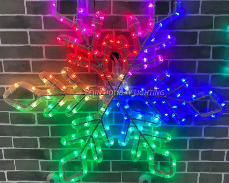 This 2D smart snowflake motif light uses aluminum frame materials and smart rope light beads. The aluminum frame has a certain stability, and the intelligent lamp beads can show a variety of different colors and different effects. The rope light is bound to the aluminum frame through a cable tie, and the whole has IP65 waterproof rating.