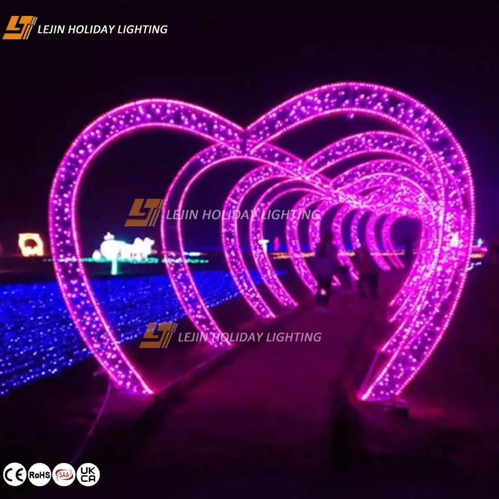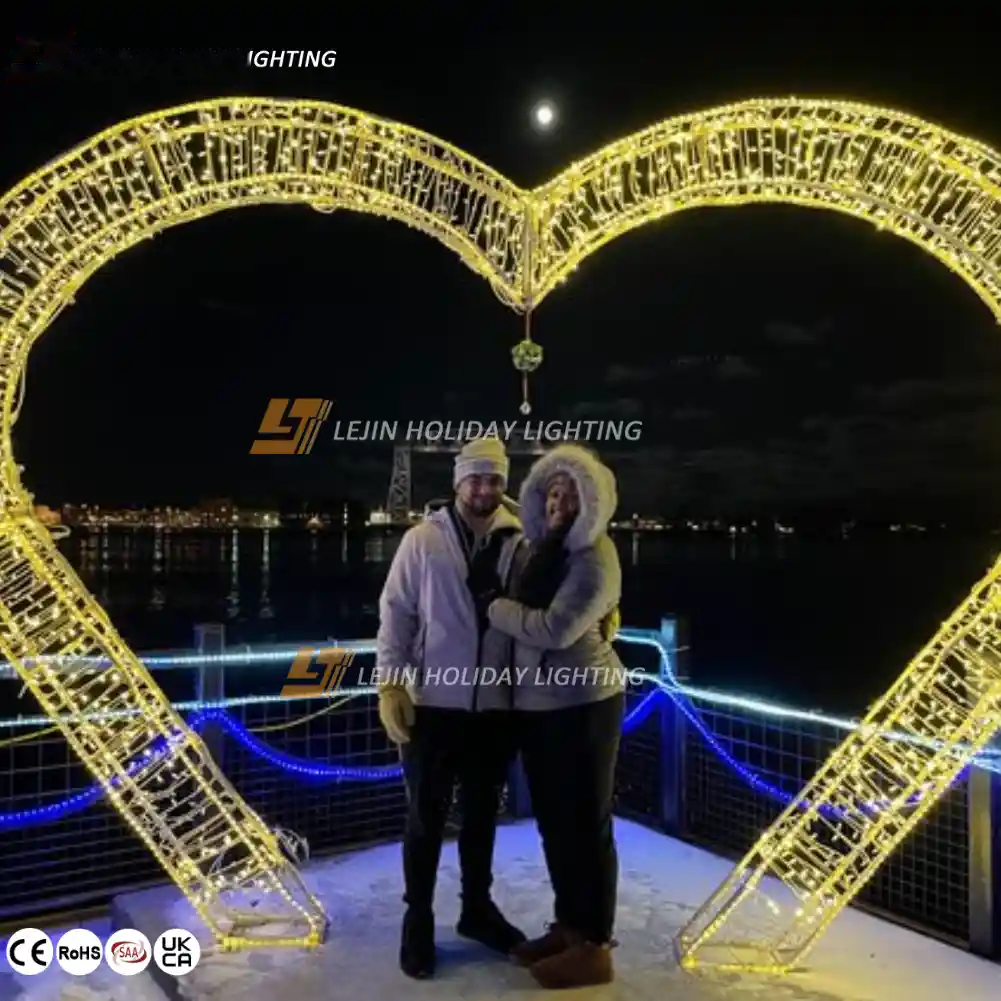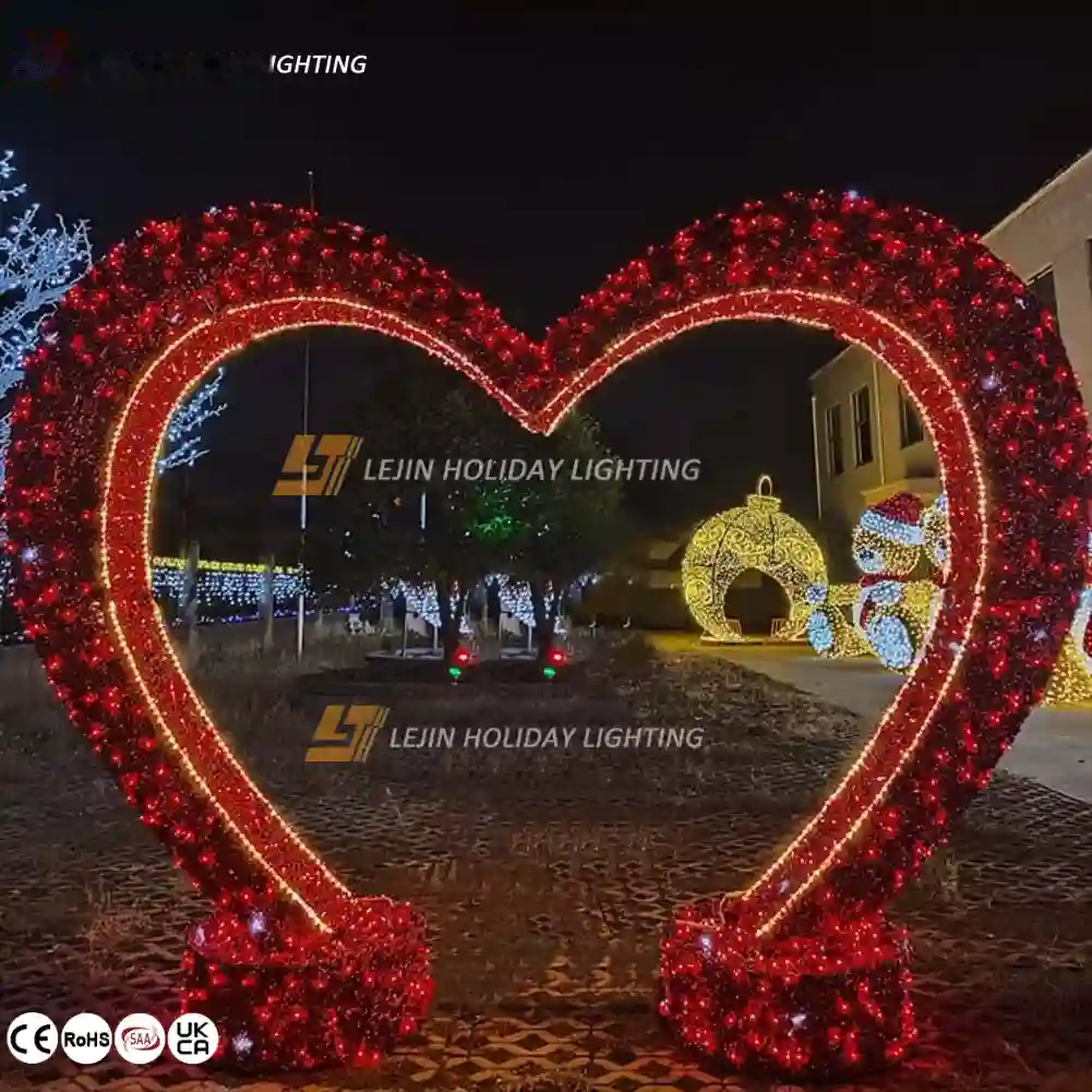 The heart-shaped 3D motif light has many remarkable characteristics.In terms of application scenarios,it is widely applicable to weddings,Valentine’s Day activities,creating a romantic and warm atmosphere and attracting everyone’s attention.Its waterproof performance is excellent.Even on rainy days or in humid outdoor environments,it can operate normally and add a touch of romantic charm to outdoor scenes.Our product is made of energy-saving and environmentally friendly materials and technologies.It has the characteristics of low power consumption and is very friendly to the environment.Colors, sizes and patterns can be customized according to customer needs to meet personalized demands.The professional design and production team ensures continuous innovation and excellent quality of products.Finally,by cooperating with efficient logistics companies,it ensures that the lamps can be delivered to customers quickly and safely, improving customer satisfaction.