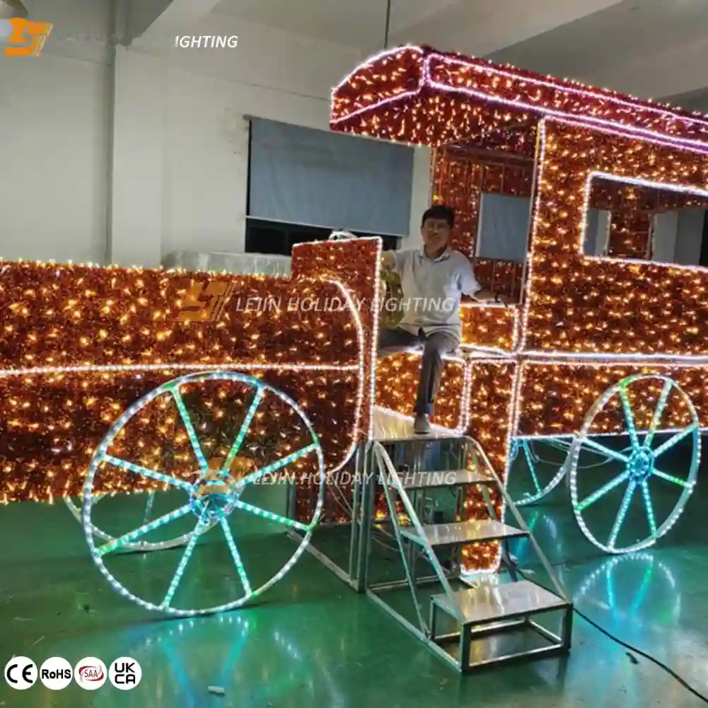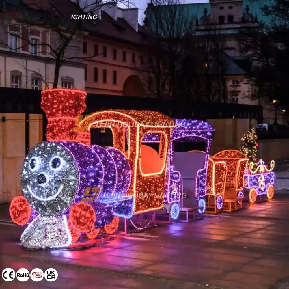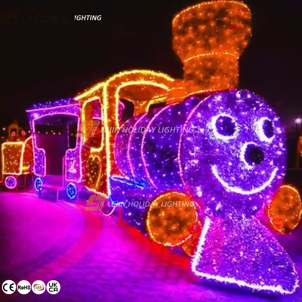 - 3D train-shaped LED motif demonstrates extremely high flexibility and adaptability. Its lighting effects are rich and diverse,can be customized,the brightness and color can be adjusted to create different atmospheres.In the amusement park,the soft and warm light seems to be the guardian light that accompanies children into sweet dreams,weaving countless imaginative dreams for them.In the shopping mall,it can also become a decorative embellishment.Through the changing light colors,it adds a romantic and warm atmosphere to family and friend gatherings or leisure time.
