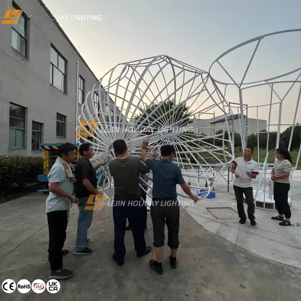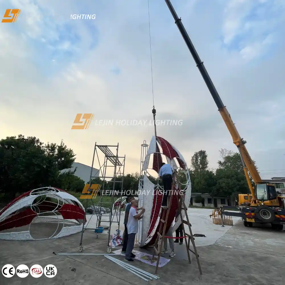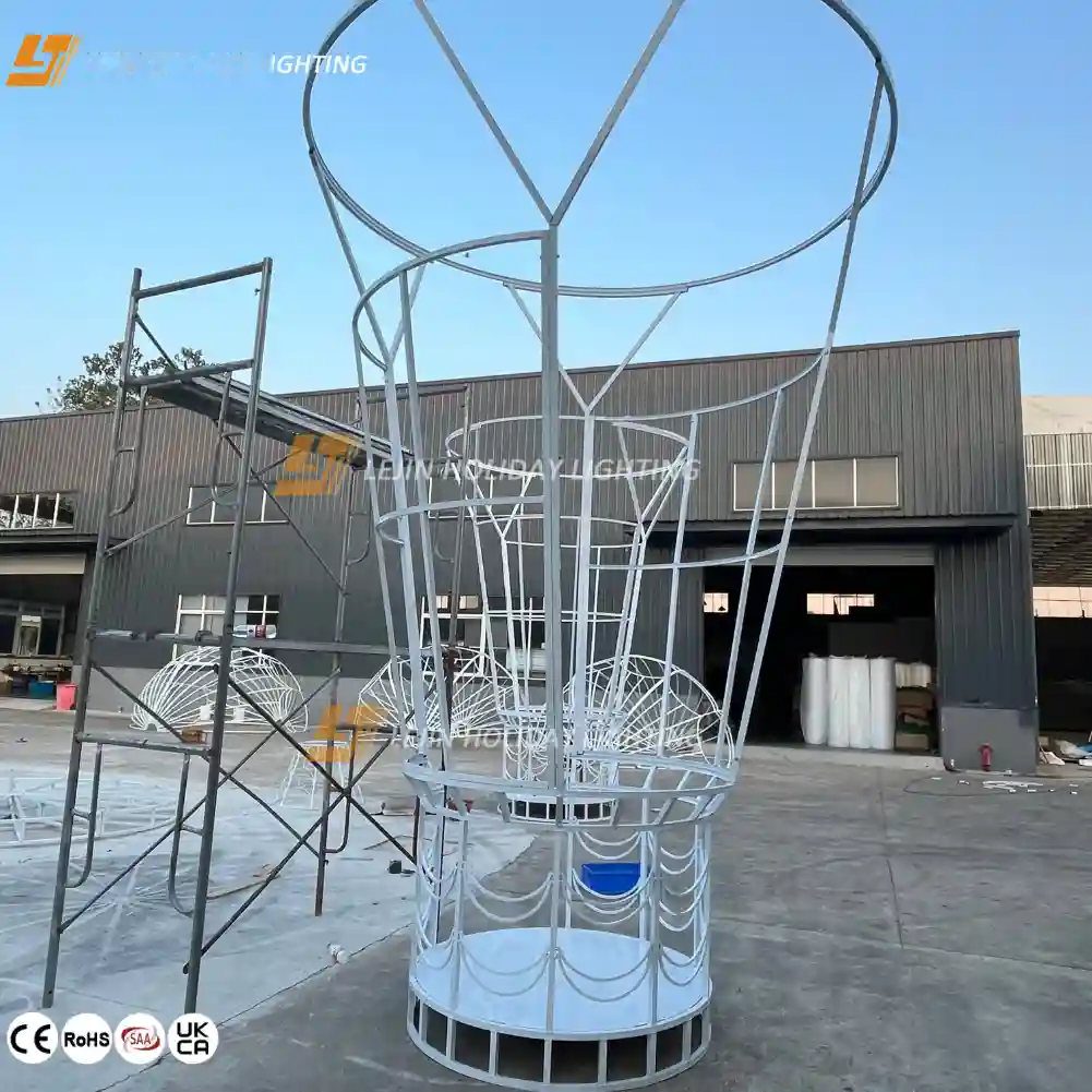 Our shopping mall decorative 3D lighting motif has a full sphere,just like a real hot air balloon.It is accompanied by an exquisitely crafted basket beneath.With an extremely pronounced 3D effect, it seems as if a genuine hot air balloon is hovering in the air,delivering a powerful visual impact.There are bright and vivid colors that can add a lively and cheerful atmosphere to the space;there are also soft and elegant tones that create a peaceful and warm feeling.You can place this product in the street green belt.Against the backdrop of lush greenery,when night falls and the soft light is on,it not only illuminates the road for pedestrians but also adds a touch of warmth and romance to the entire street.Our product can also be used in commercial places as a unique decorative element to enhance the overall decorative taste.