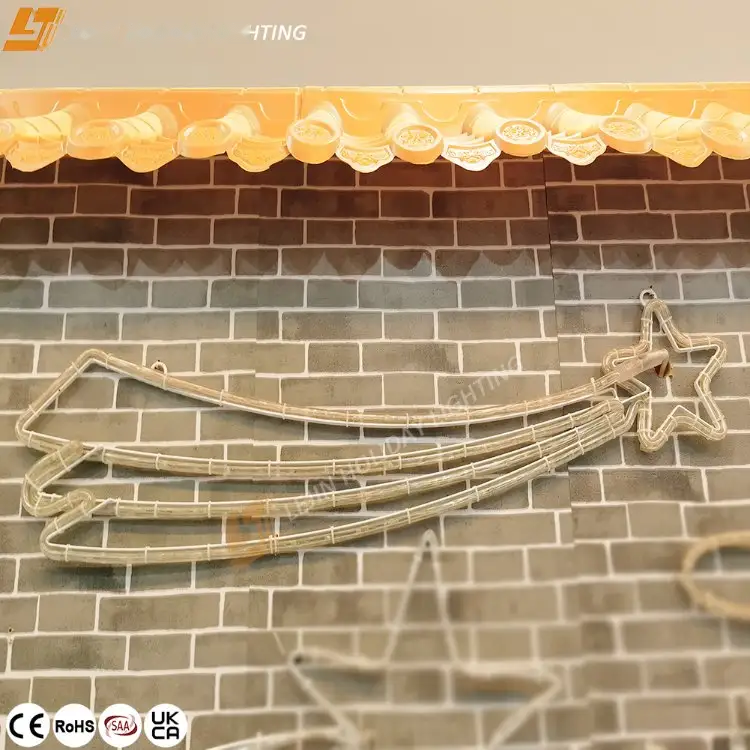 This 2D meteor motif light is composed of high-quality aluminum frame and PVC transparent rope light, and the rope light and aluminum frame are bound together with cable ties. Outdoor use has a certain IP65 waterproof grade, and can use smart light strings or smart rope lights as light source decoration.