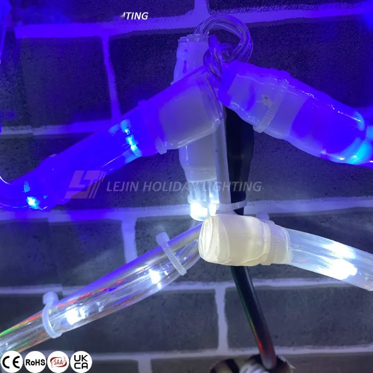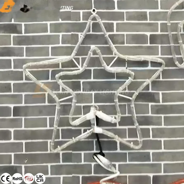 The frame of 2D double star motif light is made of iron frame material, using white light source and blue light source technology to form a double star, with IP65 waterproof rope light and 24V low-voltage transformer, making the overall IP65 waterproof, heat and cold resistance effect.