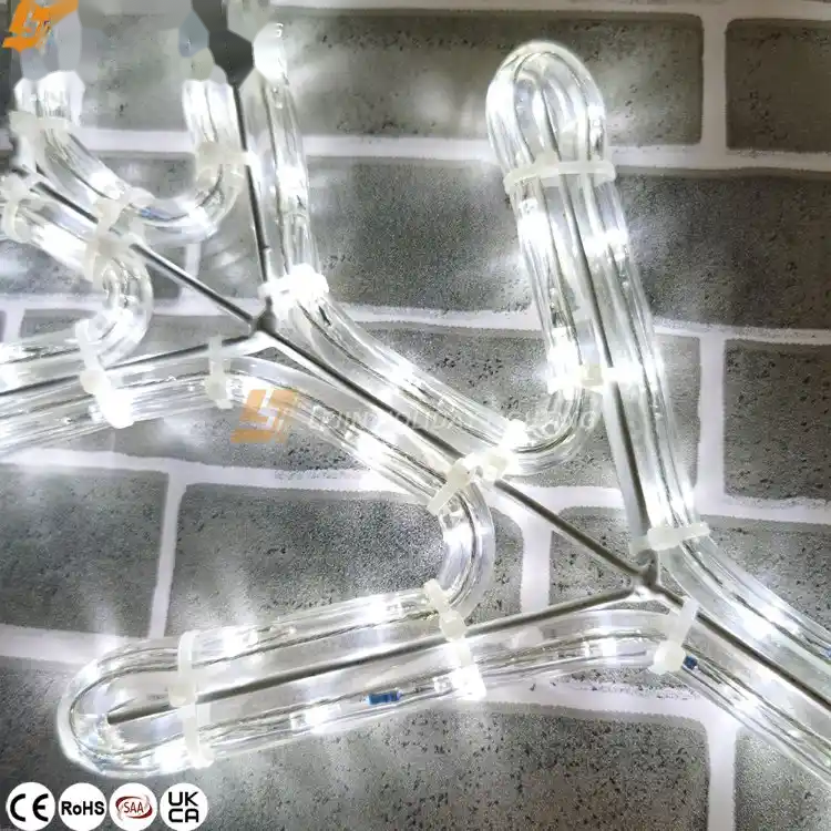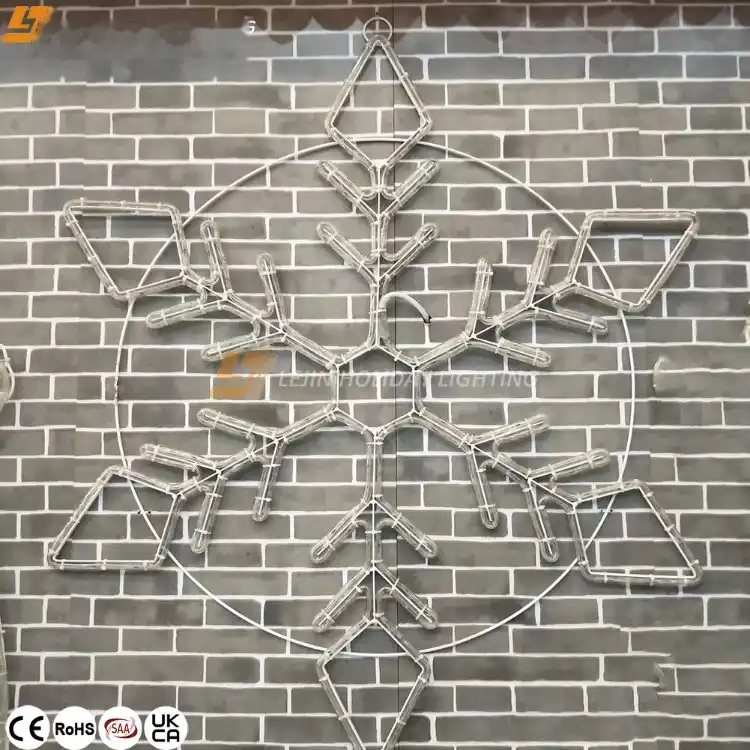 2. This 2D ordinary snowflake motif light uses white iron frame and transparent rope light to create a 2D effect, which is integrated with PVC rope lights to create a vivid vision.