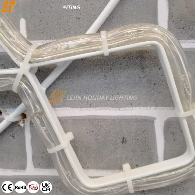 This 2D ordinary snowflake motif light adopts the rope light mode of constant light and has a variety of design forms, which can be designed according to customers’ preferences. The material is made of iron frame, and the rope light and shelf are bound together through cable ties. all use low voltage 24V transformer, outdoor decoration safety, with multi-directional IP65 waterproof and dust-proof rating.