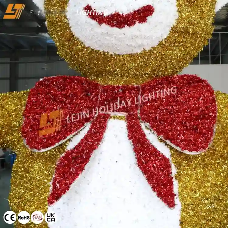 The 3D bear hat motif light adopts non-painted aluminum frame as the main body of the motif light, covers the whole body with high-quality turf to form a vivid state, uses rubber string flashing light string and rope light as the light source decoration, uses 24V transformer as the power supply, and has a strong IP65 waterproof rating and stable and solid frame.