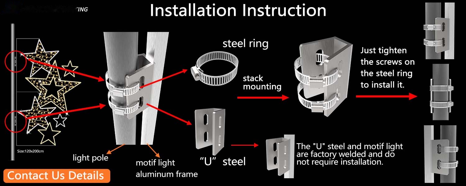The motif light of this product has fully considered the convenience of customers in its installation design. Specifically, it adopts a steel ring and “U” steel combination installation scheme. This modular design significantly simplifies the installation process: simply align the “U” steel precisely, then quickly snap it into place using the steel ring, and the assembly can be completed without the need for complex tools. Even novice operators can quickly get the hang of it.