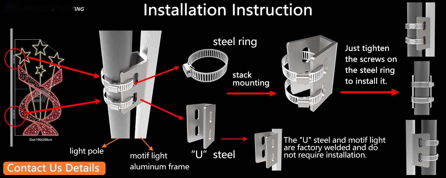 The motif light of this product has fully considered the convenience of customers in its installation design. Specifically, it adopts a steel ring and “U” steel combination installation scheme. This modular design significantly simplifies the installation process: simply align the “U” steel precisely, then quickly snap it into place using the steel ring, and the assembly can be completed without the need for complex tools. Even novice operators can quickly get the hang of it.