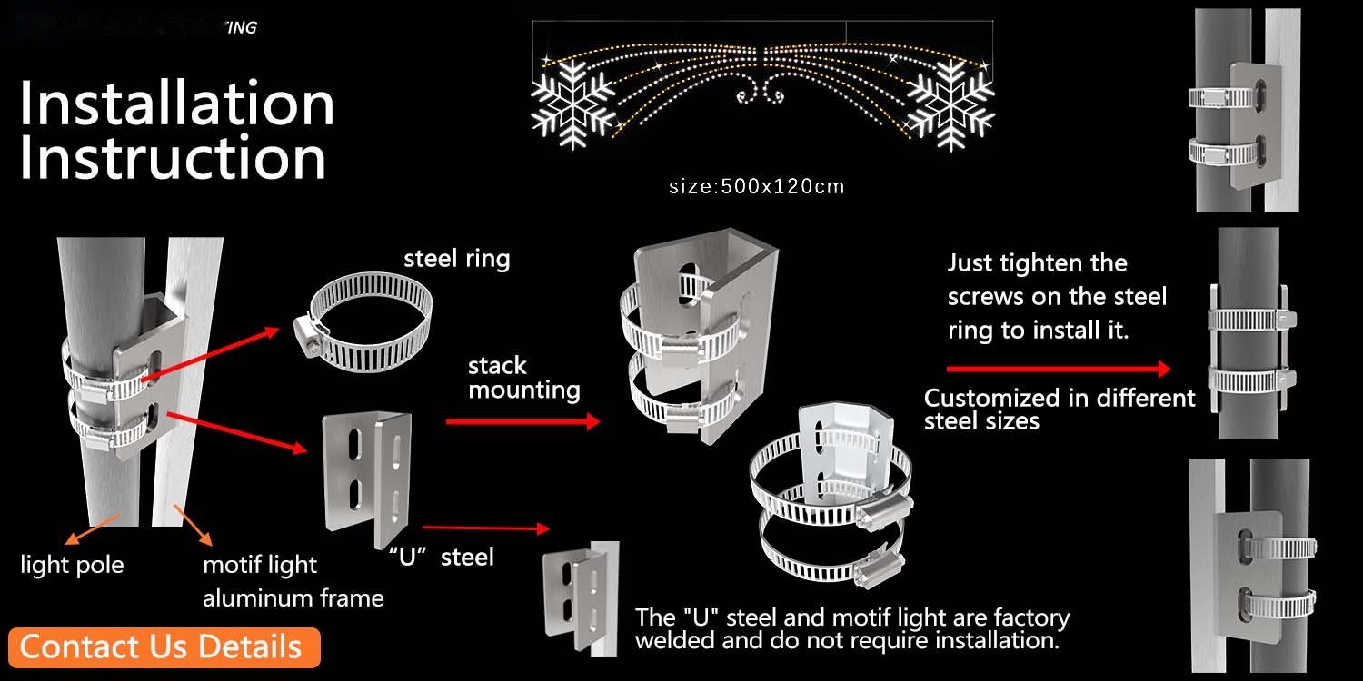 The motif light of this product has fully considered the convenience of customers in its installation design. Specifically, it adopts a steel ring and “U” steel combination installation scheme. This modular design significantly simplifies the installation process: simply align the “U” steel precisely, then quickly snap it into place using the steel ring, and the assembly can be completed without the need for complex tools. Even novice operators can quickly get the hang of it.