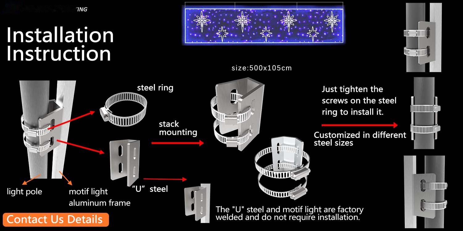 The motif light of this product has fully considered the convenience of customers in its installation design. Specifically, it adopts a steel ring and “U” steel combination installation scheme. This modular design significantly simplifies the installation process: simply align the “U” steel precisely, then quickly snap it into place using the steel ring, and the assembly can be completed without the need for complex tools. Even novice operators can quickly get the hang of it.