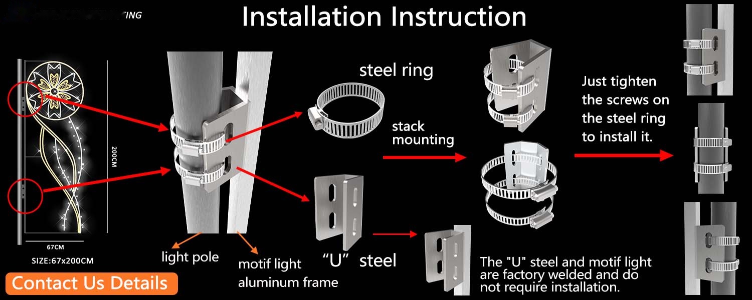 The motif light of this product has fully considered the convenience of customers in its installation design. Specifically, it adopts a steel ring and “U” steel combination installation scheme. This modular design significantly simplifies the installation process: simply align the “U” steel precisely, then quickly snap it into place using the steel ring, and the assembly can be completed without the need for complex tools. Even novice operators can quickly get the hang of it.
