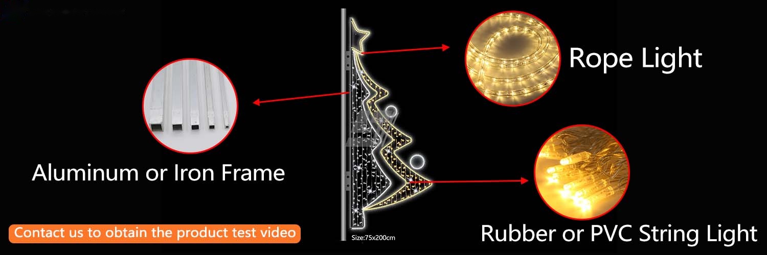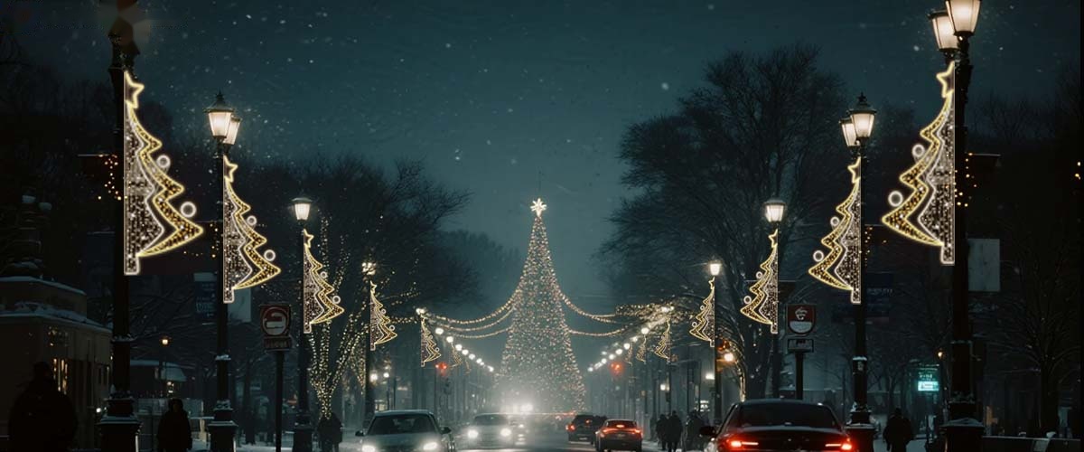 This Christmas tree bow flagpole light is themed around “Christmas tree”, weaving the symbolic imagery of Christmas into the light and shadow effect. The decorations of the Christmas tree complement the warm reverberation of Christmas songs, serving as a Christmas blessing. As the light and shadow shift, one can feel the warmth of the festival; the curved lines of the pol motif light evoke the sense of a gift-giving ceremony, like the unopened surprises under the Christmas tree, and the red glow diffuses a unique tenderness of the festival. The entire street becomes a narrative space kissed by light, and at every turn, there is a Christmas heartbeats. When these symbols spread along the street, the community path becomes a fairy-tale lane adorned with stars, with the light aura spreading with each step, and every step is filled with the joyous celebration of the festive season; the main street of the city becomes a flowing Christmas scroll, with the Christmas tree representing Christmas, wrapped around the shop windows and the tree shadows along the sidewalk, allowing the bustling street scene to be infused with a quiet celebration.