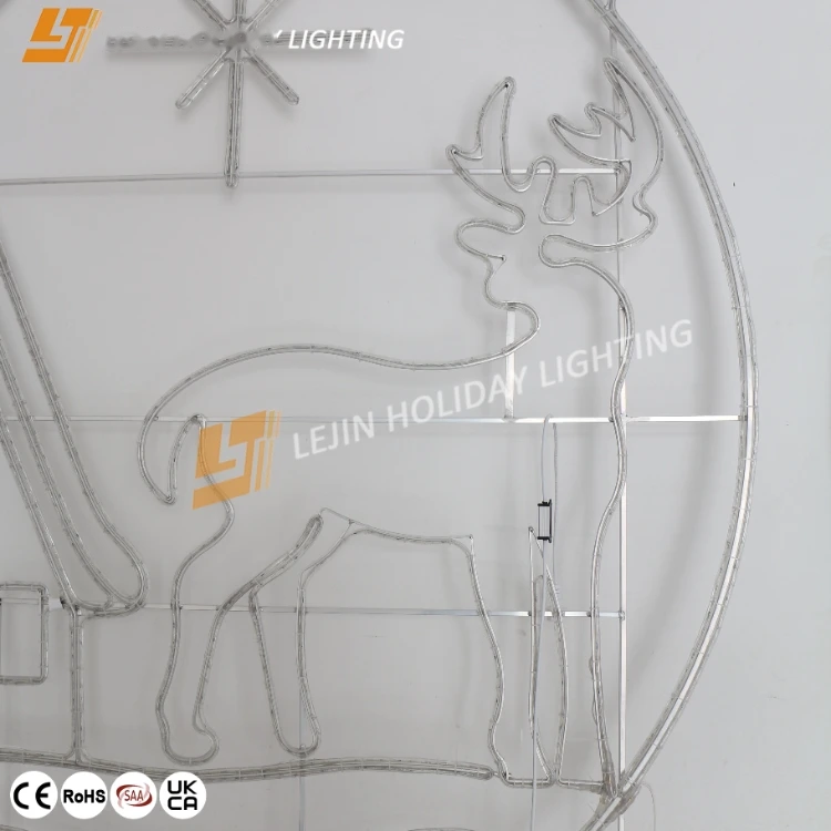 2D deer round ball motif light mainly used in Christmas scenes, mainly composed of 24V rope light and a solid aluminum frame can be waterproof and fireproof, smart rope lights can be customized for motif lights,which color can be controlled by remote control , the whole has IP65 waterproof rating.